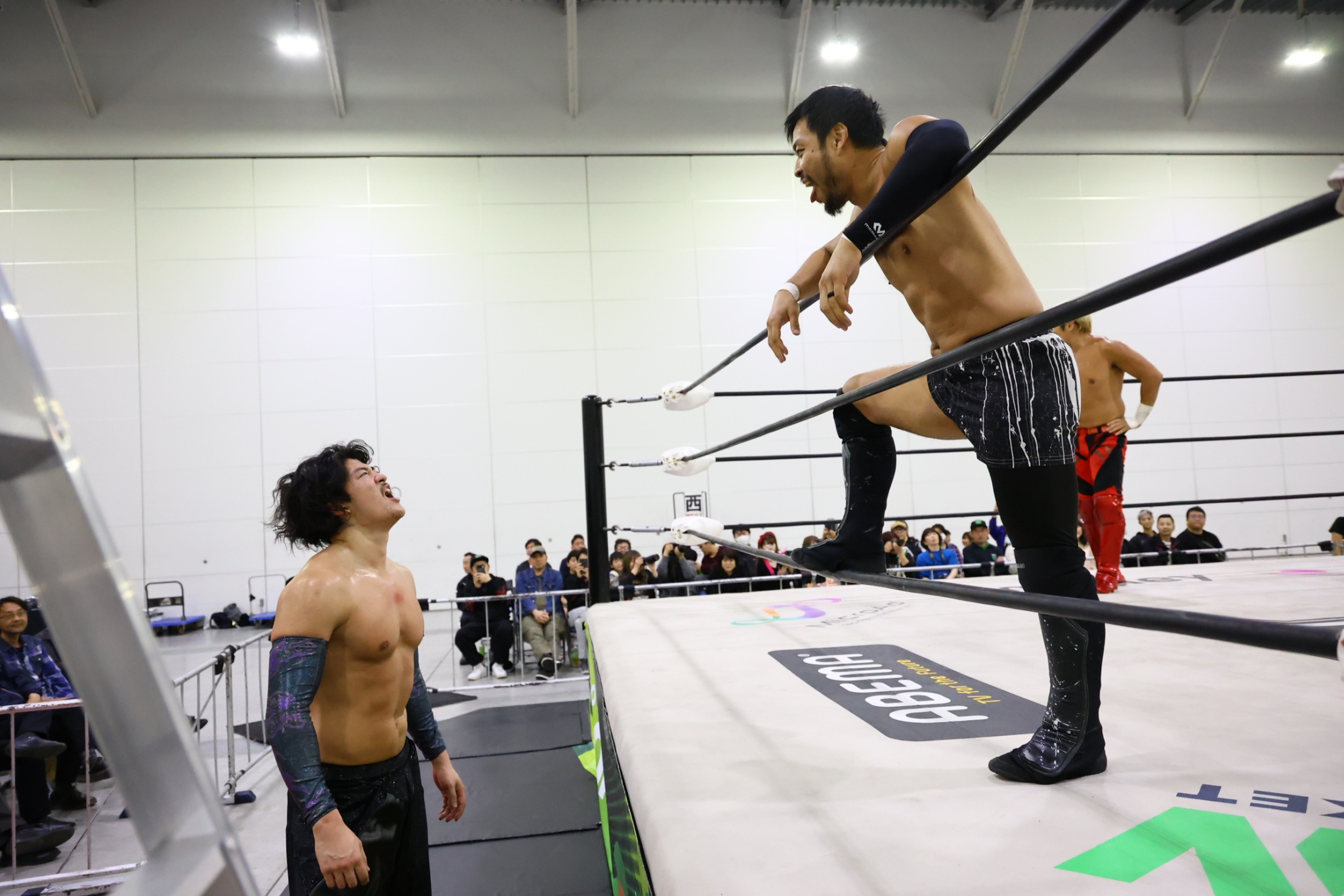 ▼ダガ「これがチャンピオンは俺たちだという証拠。この体を見てみろ。こいつ(モリス)はチャンピオン。そしてこの体を見てみろ。こいつ(遠藤)は次のナショナルチャンピオンになる。そして俺の体を見てみろ。俺たちは本物のレスラーだ。明日の大阪でようやくお前らも俺たちがチャンピオンなんだとハッキリわかるだろ。そしてガレノ、ナショナルのベルトを頂くのはこいつだからな」