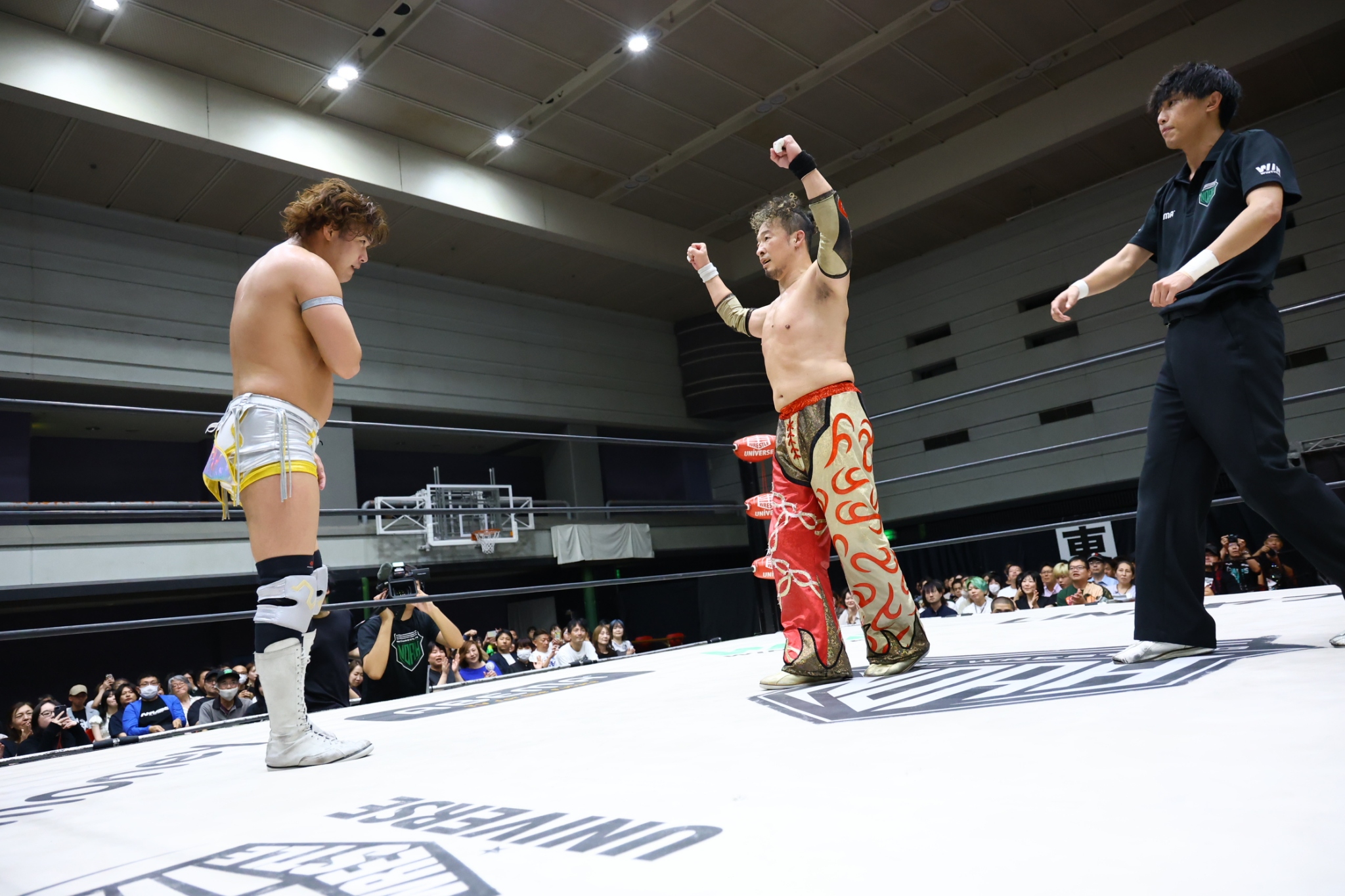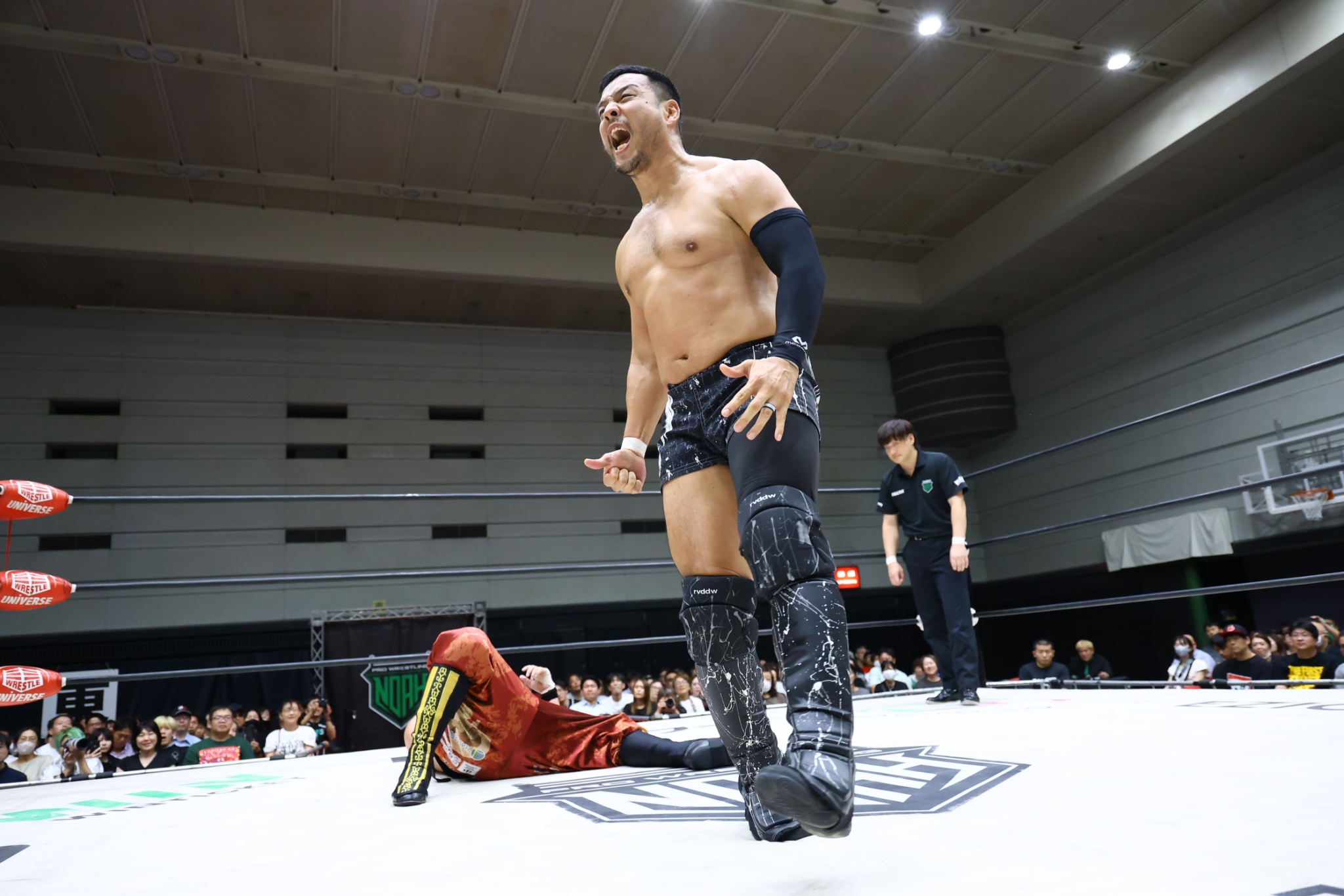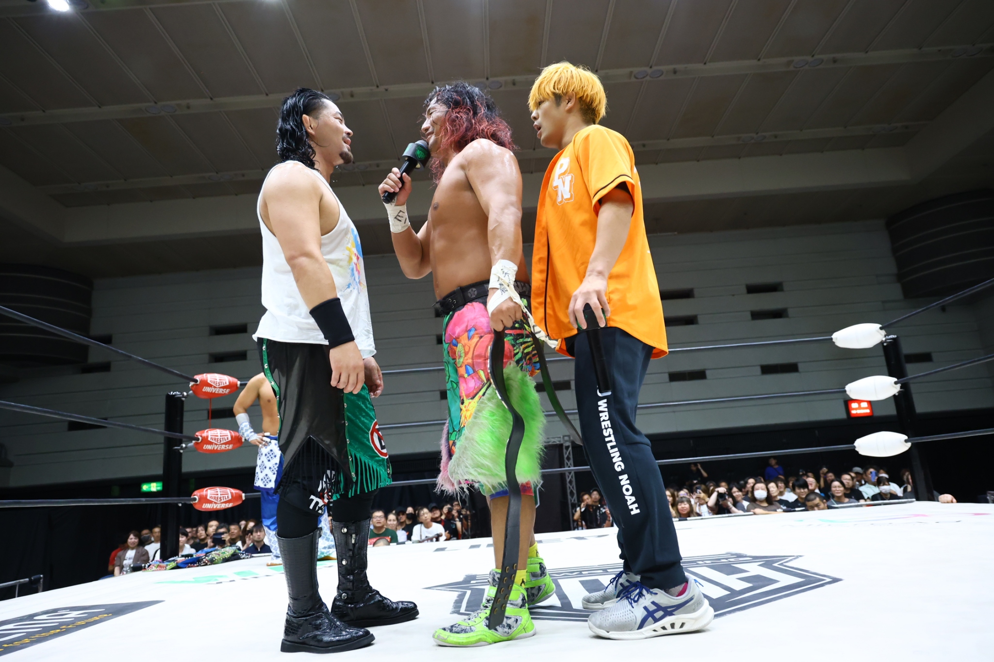 【拳王の話】「おい、大阪! ホントはな、OZAWAとシングルマッチ。ブレイクダンスもシングルマッチやる気だったけどな。OZAWAケガした? 今日どこかに来てるかと思ったぞ。おめえのケガなんかな、ウソだろ? おい。去年もそうだったぞ。おい、OZAWA、早く現れろ。いつでも俺が相手してやるよ。おいOZAWA、てめえのケガはウソだ」
