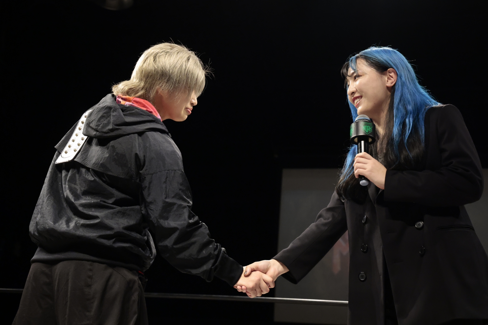 【世羅の話】「改めまして、プロミネンスの世羅りさです。どうしても彩羽匠と戦いたくて、このリングにやってきました。まさかタイトルマッチをしてもらえると思わなかったので、渡りに船ですけど。彩羽匠とはお互い新人の頃、タッグを組んで切磋琢磨していて、シングルマッチはたった1回しかしたことがありません。約10年以上ぶり、シングルマッチをこのリングで叶えることができて、大変光栄に思います。ベルトいただきます」