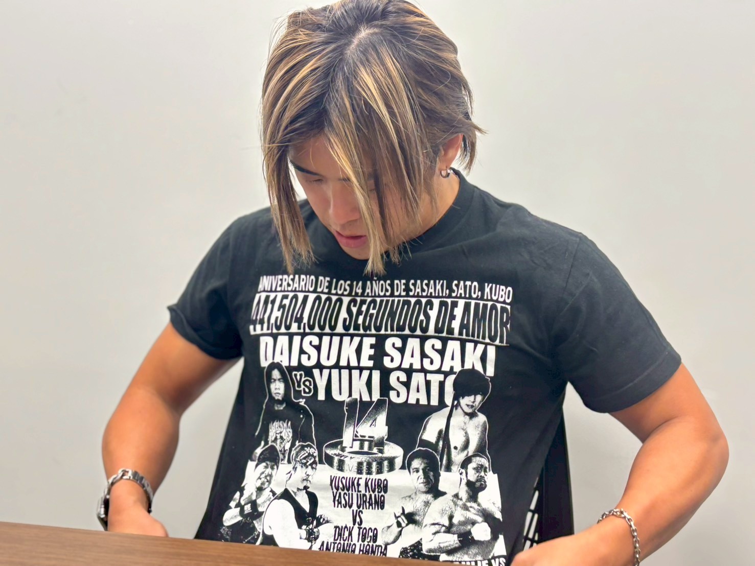 政岡「(Tシャツを指さして)"あの人"ここおるやろ。これ、さとうゆうきが消息立つ前に最後にやった興行のやつやねん。ディック東郷さんが立ち上げた『SUPER CREW』の同期で、佐々木大輔と久保佑允とさとうゆうきの3人でやったやつ。その最後に呼んでもらって。2020年やったかな。これがその時のやつや。今でも気持ちが落ちた時とか、これ着てトレーニングすることもあるで」