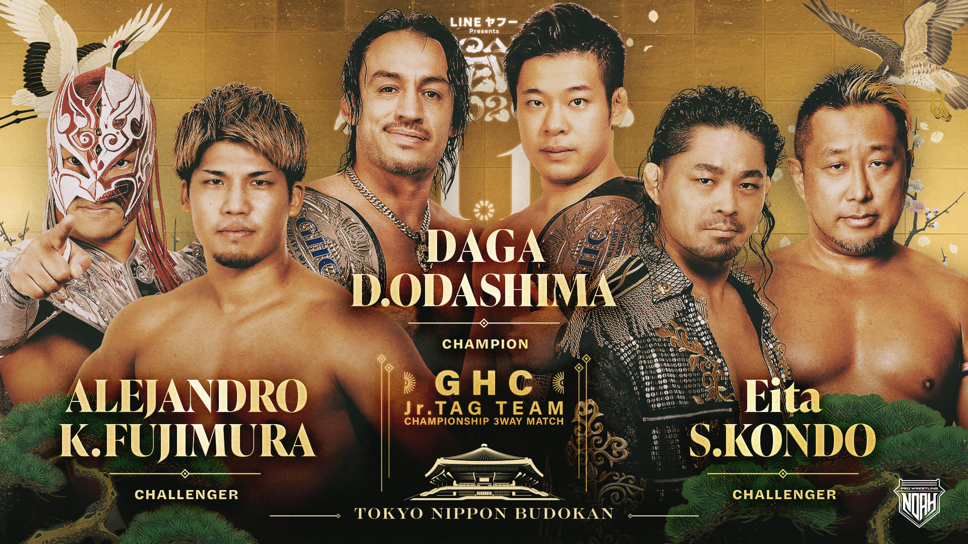 2026年1月1日(木・祝)「LINEヤフー PRESENTS NOAH “THE NEW YEAR” 2026」東京・日本武道館大会のオープニングマッチ、GHCジュニアタッグ選手権試合3WAYマッチに、王者として挑戦者を迎え撃つ小田嶋大樹に話を聞いた。
