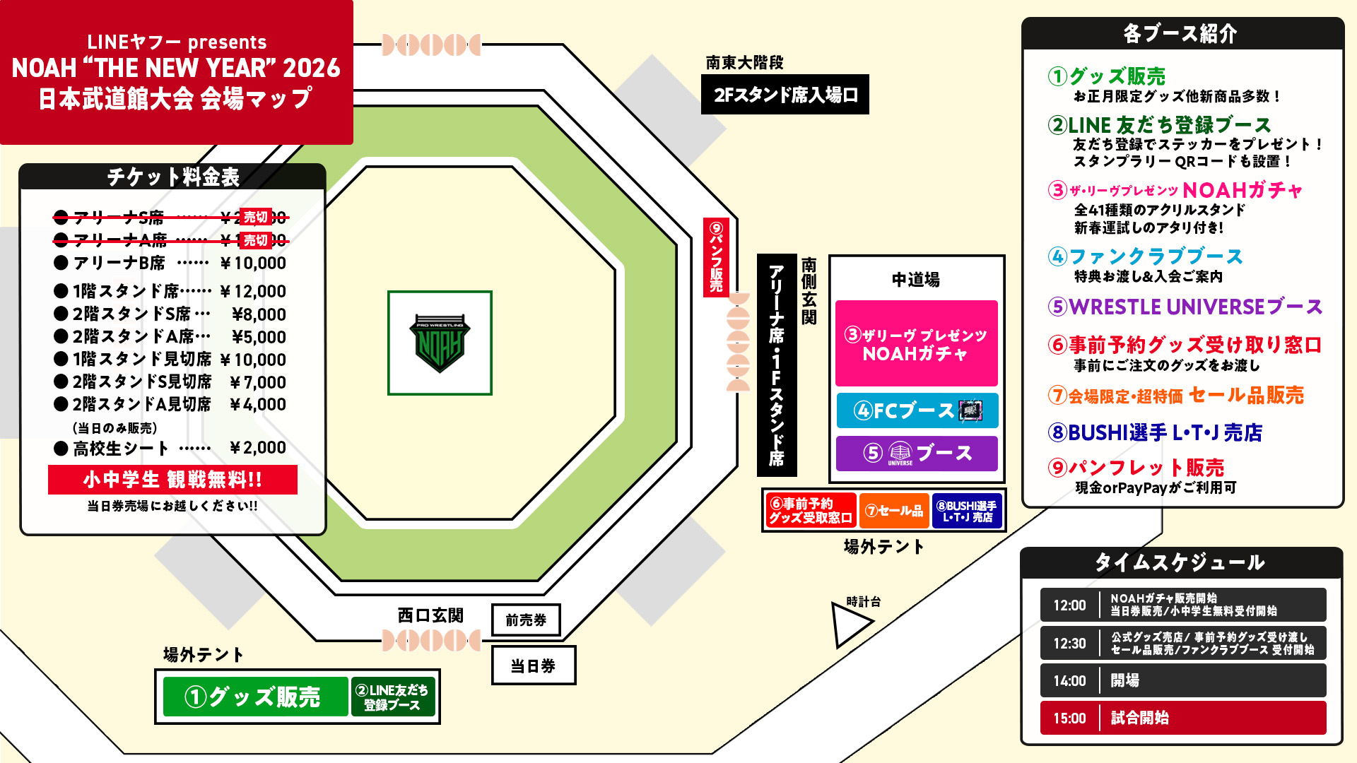 日本武道館大会当日、【元日特別価格】にてお手軽にお求めいただけるセール品を、時計台下テントのブースにて販売いたします。