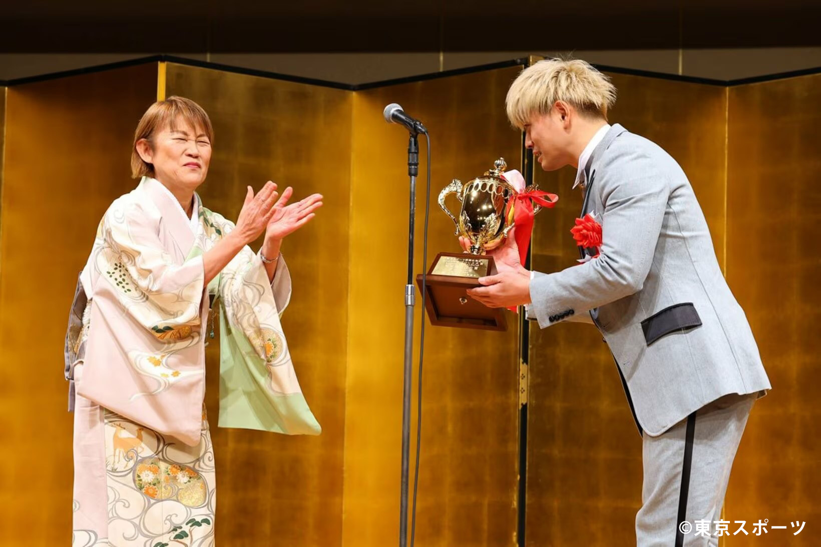 昨年に続き山田邦子さんから表彰状、トロフィーを授与された清宮は、今年はMVPを狙うと宣言。一方のOZAWAは、東京スポーツ新聞社社長から受け取った目録をその場で確かめる無作法っぷりで、コメントもOZAWA節全開で会場を後にしました。