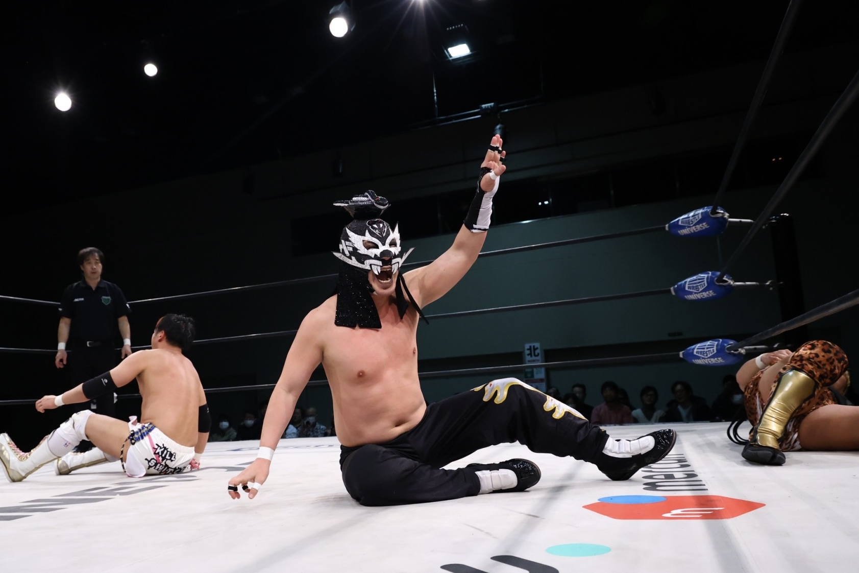 試合開始から会場は3者それぞれに声援が飛び交い、独特の空気に包まれる。序盤は牽制と駆け引きが続いたが、やがて小峠とHi69はTEAM NOAHとして一瞬の共闘を見せ、互いの意地がぶつかる場面では真正面から火花を散らした。一方のめんそーれも独特のリズムと奇襲で存在感を放ち、3WAYならではの混戦へと引きずり込む。