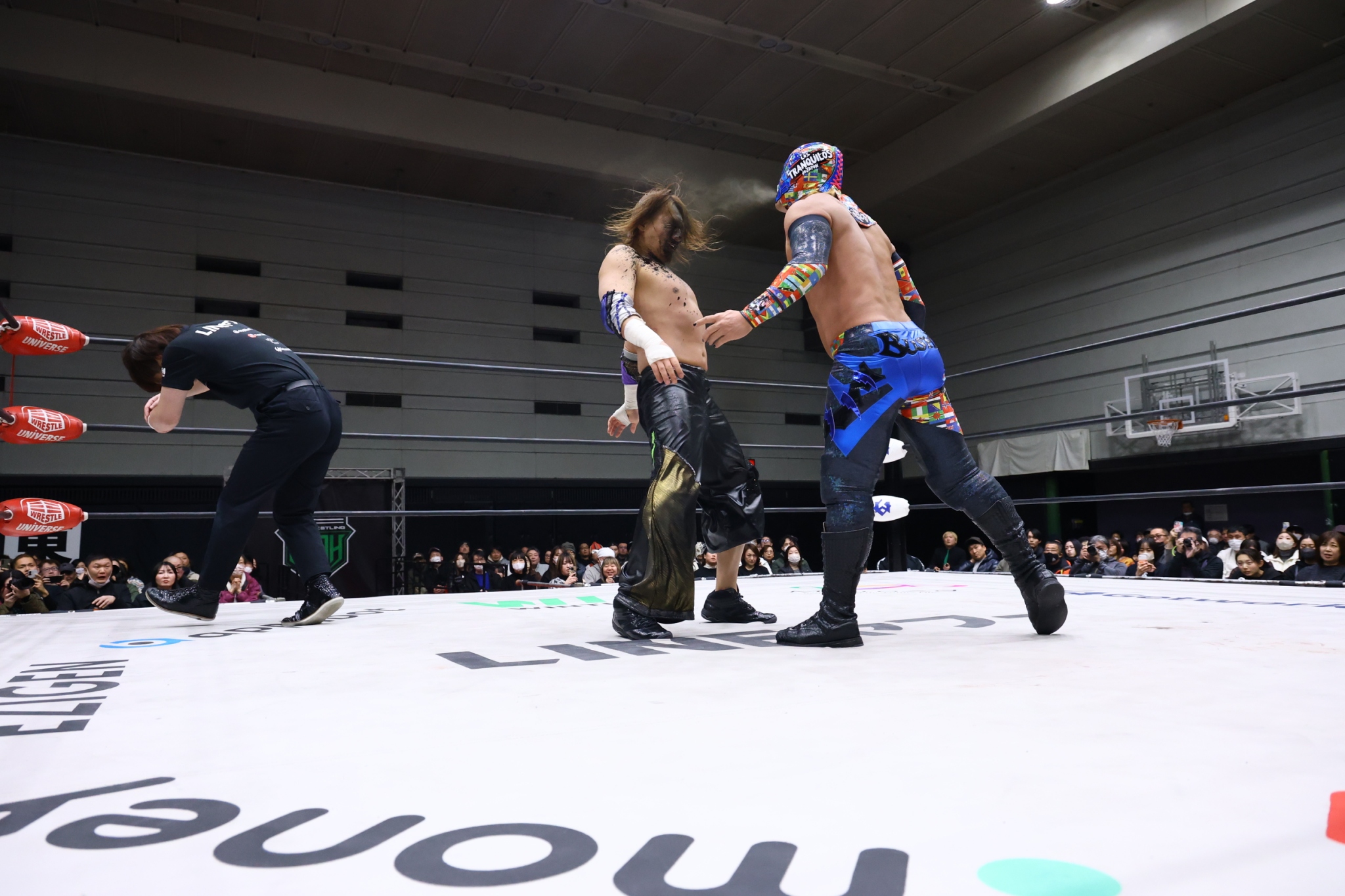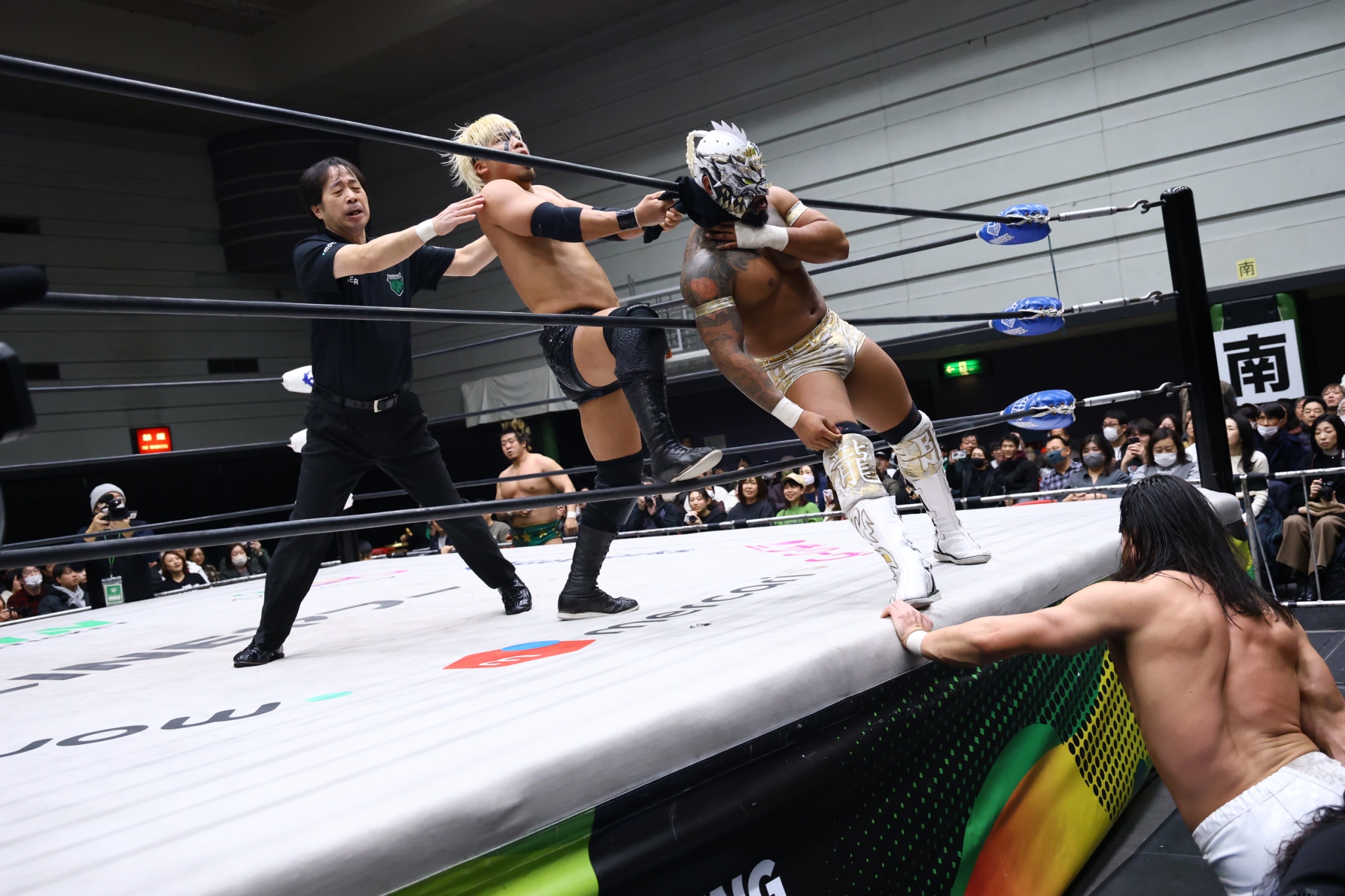 【アレハンドロの話】「丸藤さん、今日はシングルマッチ受けていただき、ありがとうございました。かつてノアジュニア全盛期、引っ張ってきた丸藤さんと戦えて、僕は心に決めましたよ。これからはアレハンドロがノアジュニア引っ張っていく。引っ張っていく存在になってやる。そして、2月6日、ノアジュニアタッグリーグ、これはジュニアの選手が主役じゃないといけない。ジュニアの選手が主役になる。この試合、メインイベントで戦わせてください。必ずノアジュニア引っ張ってみせる。アレハンドロ、ドラゴン・ベイン、この悔しさをノアジュニアタッグリーグにぶつける。ソイ、アレハンドロ!」