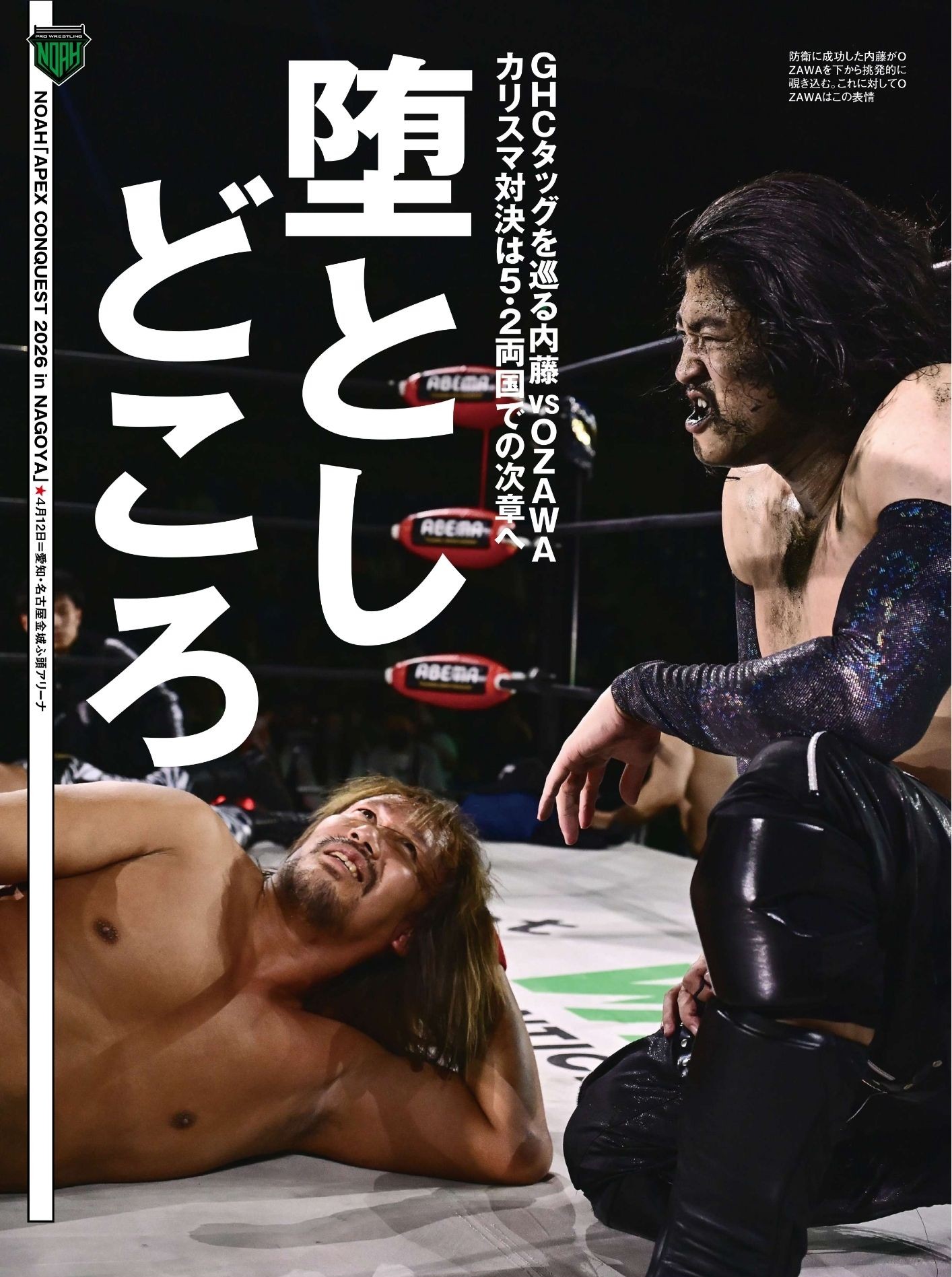 4・12名古屋大会ではYoshiki Inamuraがアルファ・ウルフを退けGHCヘビー級6度目の防衛に成功。そのほか、内藤哲也とOZAWAが激突したGHCタッグ戦や、ヨーロッパの強豪キッド・ライコス1号&2号をドラゴン・ベイン&アレハンドロが迎え撃ったGHCジュニアタッグ戦など、大ボリュームで詳報!