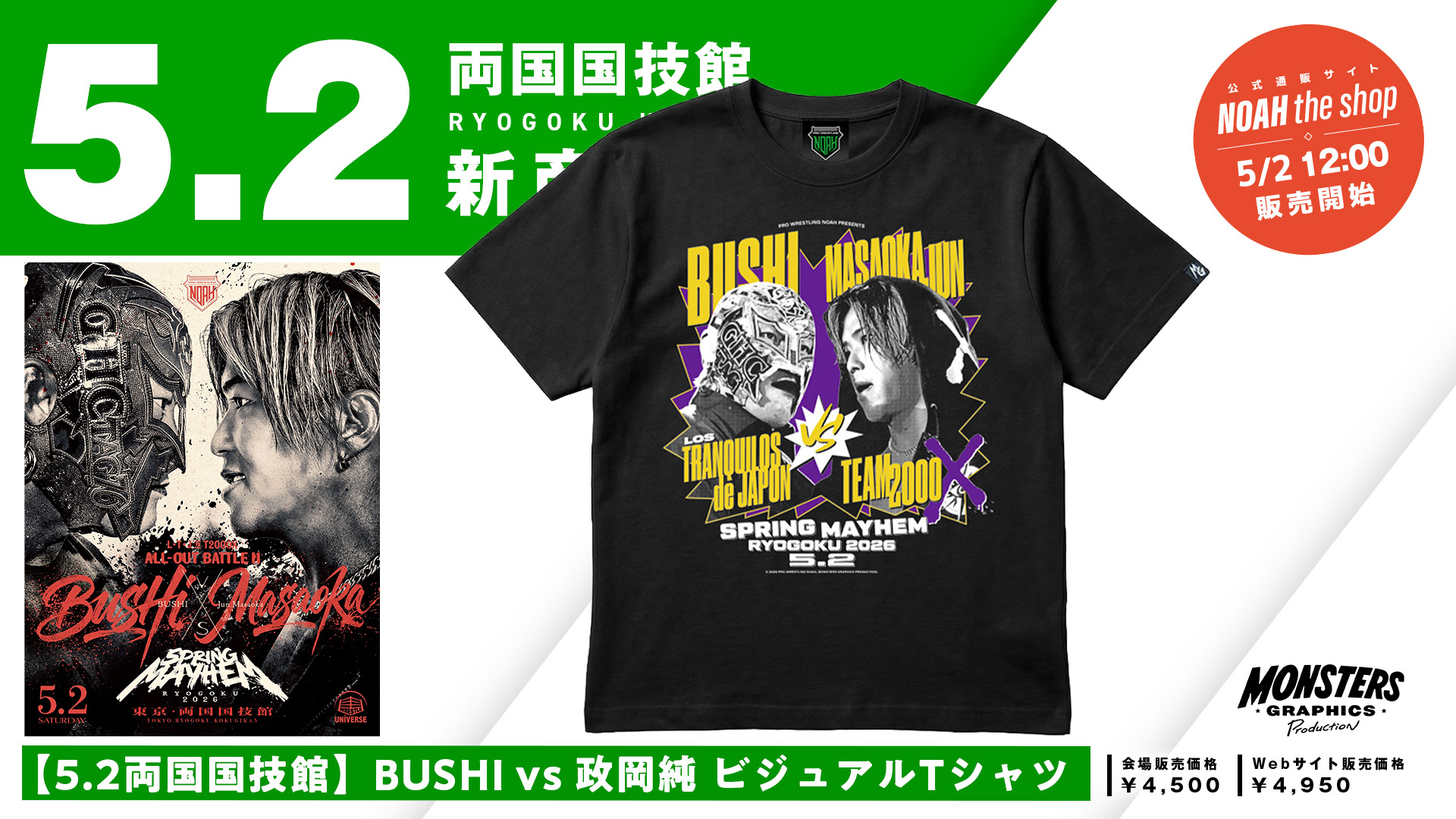 5月2日(土)に開催される、プロレスリング・ノア年間最大級のビッグマッチ『SPRING MAYHEM RYOGOKU 2026』両国国技館大会にて、新商品の発売が決定いたしましたのでお知らせいたします。