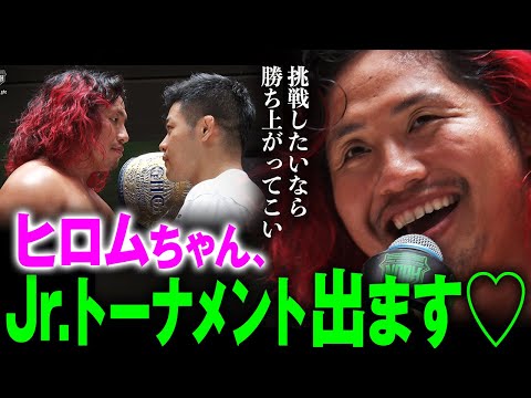 【Yoshikiの話】「イエーイ! ようやく、ようやくこのプロレスリング・ノアのナンバー1の象徴、GHCヘビーウェイトのベルトをゲットすることができました。ハコブネシップのユニバースのみんなには本当にロング・ロング・タイム、長い間サポート、そしてフラストレーションをためさせてしまって申し訳ないけど、こうして僕は今、GHCヘビーウェイトのチャンピオンとしてここに立っています。決してこれはオンリー・ミー…ミーだけでは達成できなかった。とてもヘビー、ヘビー、重い。本当に今までサポートしてくれたハコブネシップのユニバースのみんな、そして他のNOAHのレスラー、スタッフの皆さん、本当にサンキュー・ベリー・マッチ。そしてミーと今プロレスリング・ノアのリングでファイトしてくれたミスターKENTA、本当にありがとうございました。ミーはユーからこのベルトをゲットできたこと、これまでの、いや、これからもビッグ・ビッガー・ビッゲストなモーメントになることは間違いないでしょう。そしてミスター・清宮。ミーはユーの素晴らしい、アメージング、オーサムなレスリングをウォッチしてきました。そして今はミーがチャンピオンとしてユーを迎え撃つ。これはユーも言っていたが、ミーも楽しみにしていたシチュエーションです。ミスター清宮となら必ずホットで、アメージングで、そしてクールなレスリングができるでしょう。皆さん、楽しみにウェイティングしていてください。シー・ユー・アゲイン。バイバイ!」