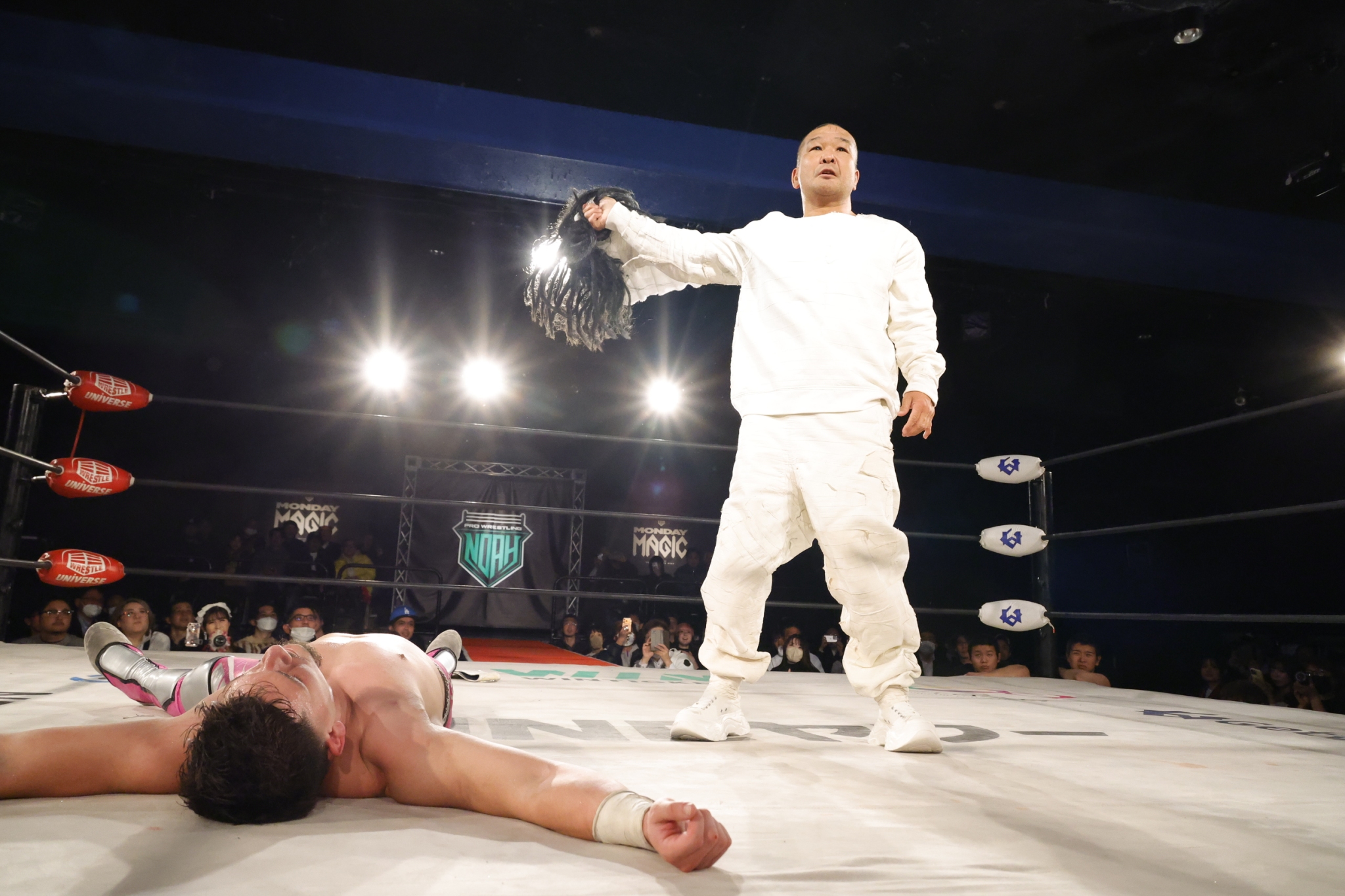 【AMAKUSAの話】「今宵もまた月曜の魔力にて、こうして王者として帰ってこれたこと、嬉しく思っておりまする。いよいよNOAH Jr. TAG LEAGUEまであと4日。小峠殿。そなたが申しておったな。そなたが輝いておったのは遙か昔の話だと。大切なのは、そこではないのではありませんか。あの時の輝くそなたと戦うのを我は楽しみにしておりまする。いざ尋常に勝負! 申し上げまする」